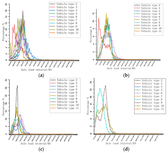 Axial load spectrum: (a) axle load spectrum of single axle; (b) axle load spectrum of single axle with dual wheels; (c) axle load spectrum of tandem; (d) axle load spectrum of tridem.