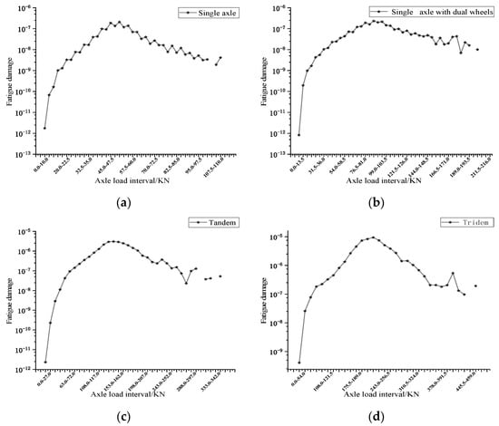 Accumulated fatigue damage at a single temperature: (a) axle load spectrum of single axle; (b) joint axle load spectrum of single axle with dual wheels; (c) joint axle load spectra of tandem; (d) joint axle load spectra of tridem.