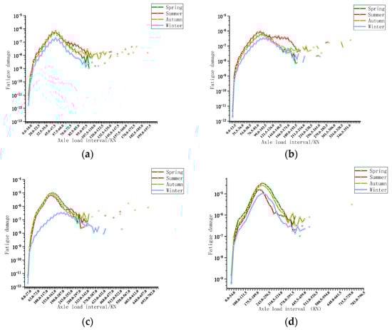 Accumulated fatigue damage at different seasonal temperatures: (a) fatigue damage of single axle in four seasons; (b) fatigue damage of single axle with dual wheels in four seasons; (c) fatigue damage of tandem in four seasons; (d) fatigue damage of tridem in four seasons.
