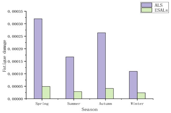 The cumulative fatigue damage calculated using the ALS method across the four seasons, respectively, is 6.51, 5.88, 6.42, and 4.60 times that of the fatigue damage calculated using the ESALs method. The annual cumulative fatigue damage is 8.60 × 10−4 and 1.42 × 10−4, with the former being approximately 6.04 times that of the latter, which was consistent with the results of a single vehicle and single month.