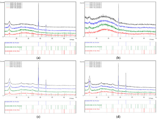 GIXD data of Al2O3/IF-WS2 coatings: (a) sample 1—Method A; (b) sample 2—Method B; (c) sample 3—Method A; and (d) sample 4—Method B.