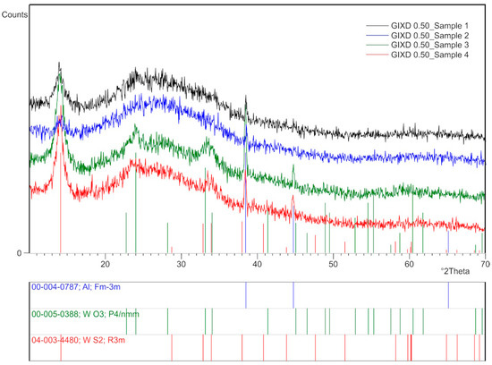 Figure 4 shows the summary of GIXD diffractograms obtained at an incidence angle of 0.50° for all samples. It can be observed that the highest reflections originating from the WO3 phase are present in samples 3 and 4. The formation of WO3 from WS2 is most likely associated with the high energy during the dispersion of WS2 in a sonicator. Other methods for synthesizing WO3 were cited in Pragati’s work [40], including Mandal’s study, in which water-dispersed WO3 was prepared from commercial WS2 powder [41].