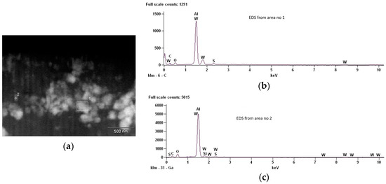 To analyze the composition of the nanosized Al2O3 fibers containing self-arranged IF-WS2 NPs, the fabricated samples were examined using a HITACHI S-4700 (Hitachi, Tokyo, Japan) scanning electron microscope (SEM) equipped with a NORAN Vantage digital energy dispersive X-ray microanalysis (EDS) system. The surface and cross-section of the Al2O3/IF-WS2 NPs coatings were analyzed using SEM in the secondary electron (BSE) mode with a yttrium aluminum garnet (YAG) detector. The YAG single crystal was employed to minimize electron dose. The cross-section of the Al2O3/IF-WS2 NPs was acquired by fresh fracture. Prior to this analysis, the samples were coated with a thin carbon film using a sputtering apparatus to enhance image contrast and prevent blurring caused by charge accumulation.