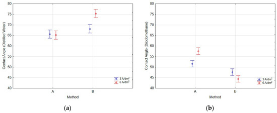 Charts of marginal means and confidence intervals (95%) for the contact angle measured using (a) distilled water and (b) diiodomethane.