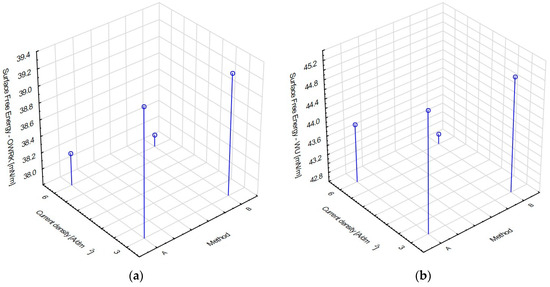 To investigate the impact of input parameters on the contact angle, an experiment based on the 2k factorial design without repetition was conducted using Statistica 13 software. The independent variables chosen for this study were current density (3 and 6 A/dm2) and method (A and B), while the dependent variable was the contact angle. A benchmark analysis of all dependent variables against a factorial design and a two-factor model with interaction was conducted. A Pareto chart was selected due to its efficiency in identifying the factors exerting the greatest influence on the process. This chart is commonly employed to assess the magnitude and significance of effects. In statistical software, the p-value is frequently utilized for interpreting the statistical significance of factors in the process. In the Pareto chart, bars that intersect the reference line (in the current article, p-value = 0.05) are considered statistically significant at the 0.05 level. In statistical analysis, normal probability plots of residuals are utilized to assess whether the residuals of a model (i.e., the differences between observed and predicted values) follow a normal distribution. This is crucial because many statistical techniques, such as linear regression, assume that residuals are normally distributed. If the residuals are normally distributed, the points on the plot should align along a straight line. Deviations from this line may indicate departures from normality [37]. Additionally, marginal mean plots with 95% confidence intervals were utilized to visually represent the statistical analysis of the results. The DOE methodology is discussed in detail in studies [38,39].