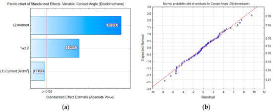 To determine the relationship between the method for obtaining coatings and contact angle measurements, Pareto charts were made for contact angles determined for distilled water (Figure 11a) and diiodomethane (Figure 12a). Pareto chart analysis (Figure 11a) revealed a linear dependence in the influence of the method of introducing IF-WS2 NPs into the Al2O3 coating, the current density used to obtain Al2O3, the interaction between the method, and current density on the contact angle values of distilled water. In the case of diiodomethane, a significant impact on the contact angle value was observed for the method of introducing IF-WS2 NPs into the coating and the interaction between the method and current density (Figure 12a). Figure 11b and Figure 12b present the normal probability plots of residuals for distilled water and diiodomethane, respectively. Based on the obtained plots, it is assumed that the residuals of the statistical model follow a normal distribution, indicating that the linear model used for statistical analysis is reliable.
