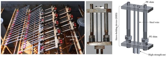 The preloading stress of the steel wire specimen is maintained with a stress-holding device (SHD) throughout the experiment, as shown in Figure 1. A tensile force is applied by the counterforce frame. The SHD with a steel wire specimen is installed on the counterforce frame and stretched with the lifting jack. The real-time strain is monitored throughout the preloading procedure with electronic extensometers and an acquisition device; the system can measure a strain range of 105 με with a precision of 20 με. The electronic extensometers are fixed on the specimen.