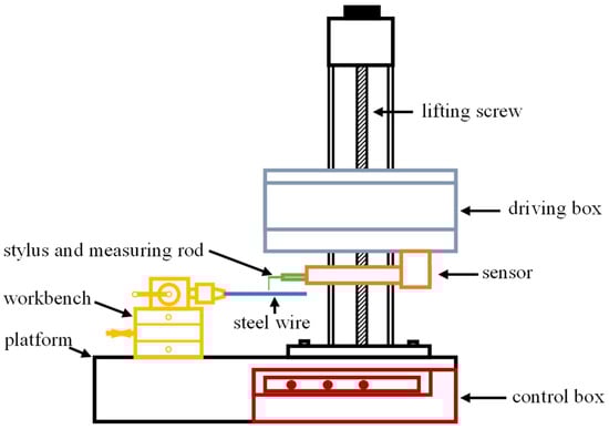 Owing to the cylindrical surface of the high-strength steel wire specimens, it is difficult to measure the surface pitting corrosion depth directly. Therefore, a high-precision line-scan mechanical probe contact surface roughness profiler (Model JB-5C, manufactured by Shanghai Tai Ming Optical Instrument, Shanghai, China) was used to measure the surface pitting corrosion on the specimens, as shown in Figure 2.