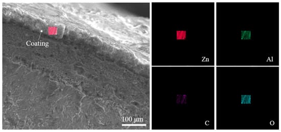 It can be seen from Figure 4 that the thickness of the coating is approximately 75 μm. According to the region scanning results using an energy-dispersive spectrometer (EDS), shown in Figure 4, the proportion of zinc and aluminum in the zinc–aluminum alloy coating is approximately 95% and 5%, respectively.