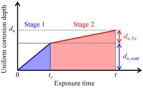 where du(t) is the uniform corrosion depth of the specimen at exposure time t, tc is the critical time at which the coating is completely consumed, du,coat(t) refers to the time-dependent uniform corrosion depth of the coating, du,Fe(t) is the time-dependent uniform corrosion depth of the iron matrix, ψ1 and γ1 are model parameters for the coating corrosion, and ψ2 and γ2 are model parameters for the iron matrix corrosion.