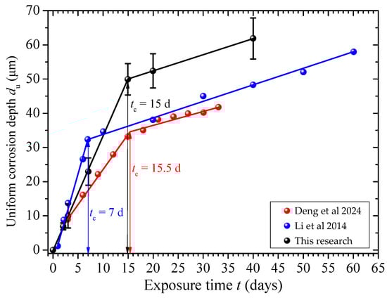 The measured data and fitting results for the uniform corrosion depth are shown in Figure 9.