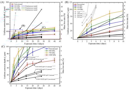 It can also be observed from Figure 7 that the critical time indicating the conversion from coating corrosion to corrosion of the iron matrix is invisible. In this case, the two-stage model has difficulty accurately describing the pitting corrosion behavior of specimens under stress conditions. Thus, a continuous power model is introduced to describe the time-dependent uniform corrosion depth, which can be expressed as follows: