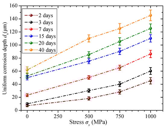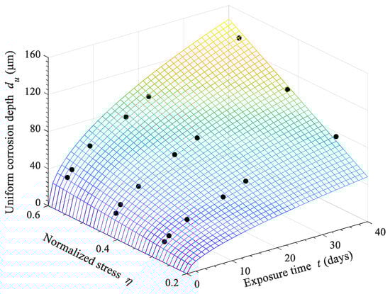 It can be seen from Figure 8 that the preloading stress affects the uniform corrosion depth linearly. Because the stress imposed on the specimens is smaller than the yield strength, the material properties of the high-strength steel wire are in the linear elastic stage. For a certain corrosion time, the effect of the preloading stress on the uniform corrosion depth is in accordance with the linear model. Thus, the uniform corrosion depth considering the corrosion time and stress condition can be generated from the experimental results as follows: