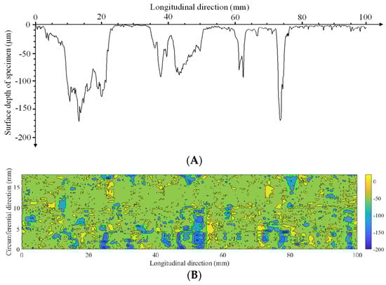 Pitting corrosion measuring result of specimen with exposure time of 40 days and stress condition of 750 MPa: (A) measuring line at 0°; (B) contour plot.