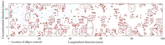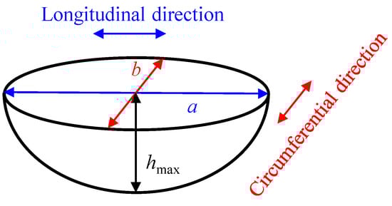 The corrosion pits are modeled as semi-ellipsoids in this study, as shown in Figure 11, based on their actual geometric characteristics. In Figure 11, parameters a and b refer to the axis lengths of the ellipse projected on the surface of the steel wire specimen. The corrosion pit depth, hmax, is defined as the maximum value within the corrosion pit region.