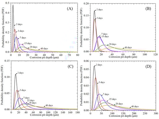 Fitted lognormal distribution of pitting corrosion depth of corrosion pits under different stress conditions: (A) 0 MPa; (B) 500 MPa; (C) 750 MPa; (D) 1000 MPa.