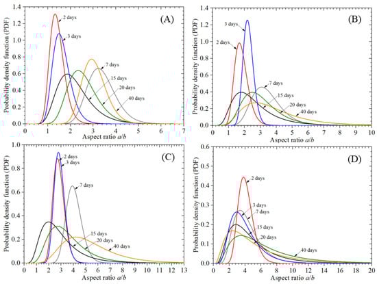 The aspect ratio a/b can be used to intuitively characterize the planar shape of corrosion pits. The major axis of the ellipse is along the circumferential direction for a/b < 1, whereas the corrosion pit develops along the longitudinal direction for a/b > 1, which becomes very large with increasing exposure time under the stress condition. The planar shape of the corrosion pit is circular when a = b, and this case will not be discussed separately herein. The time-dependent statistical results for the aspect ratio of the corrosion pits on steel wire specimens under different stress conditions are fitted with lognormal distributions, as shown in Figure 14.