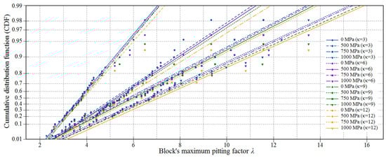 Figure 15 depicts the fitted Gumbel distribution results for different blocks and stress conditions. Figure 15 shows that the Gumbel distribution functions present a group of parallel lines under the same stress conditions, indicating that the scale parameters are only related to the stress conditions. The scale parameter increases with increasing preloading stress, which indicates that the presence of stress causes the variability in the maximum pitting factor to increase.