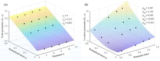 The location parameters are generally considered to have a linear relationship with ln κ. Therefore, the scale parameter and location parameter considering the spatial effect scale factor and stress condition can be defined as follows: