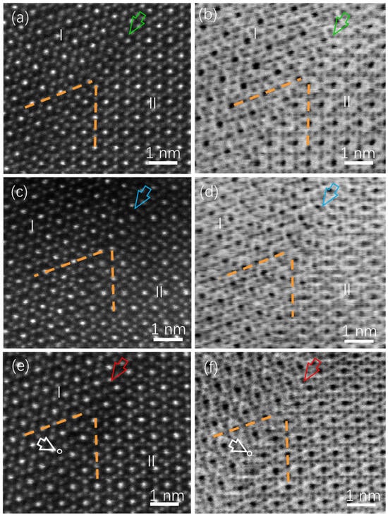 High-resolution STEM experiments were conducted in order to definitively discern the atomic structure of TBs viewed along [10] the zone of the axis of the STO substrate. Numerous STEM measurements show the simultaneous presence of three distinct types of TBs in the LFO film. Figure 2 displays three groups of STEM-HAADF and ABF images of TBs; Figure 2a,b show the HAADF image and ABF image of TB I, indicated by green arrows; and Figure 2c,d display the HAADF image and ABF image of TB II, indicated by blue arrows; also, Figure 2e,f show the HAADF image and ABF image of TB III, indicated by red arrows. The film was separated into domain I and domain II by the TBs. It was found that domains I and II display a reflection symmetry across the TB I in Figure 2a, indicated by orange dashed lines. On the contrary, domains I and II, separated by either a TB II or a TB III, exhibit a combination of a glide transformation and reflection symmetry, which is also indicated by orange dashed lines in Figure 2b,c. Based on the STEM-HAADF imaging principle, the intensity in the HAADF image directly correlates with the atomic number (Z) [26]; as a result, the heavier atoms appear brighter, and, additionally, the higher atomic density also generates a brighter contrast. Only the Fe atomic columns are visible in the HAADF images in Figure 2, while oxygen columns remain undetectable due to significantly weaker scattering. The contrast variation in cation columns arises from the varying density of Fe atoms in [10] the projection direction. It is clear that the cation arrangement of TB I is symmetric, in contrast with those of TB II and TB III, which are asymmetric, and the three types of TBs all lie in (111) habit planes. Remarkably, TB III presents cation deficiency, which induces intensity variation in the atomic columns, as marked by a red arrow in Figure 2e. The white arrow demonstrates the atomic column with cation deficiency in Figure 2e.