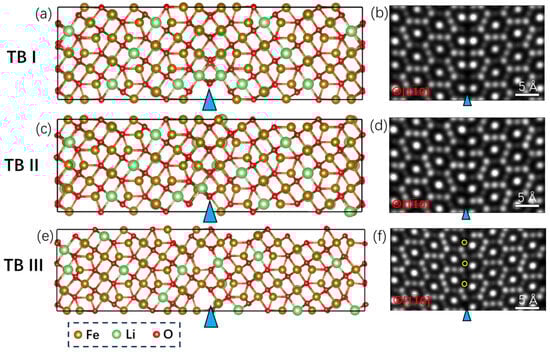 (a,c,e) The optimized atomic models of TB I, TB II, and TB III and the vertical blue arrows denote the boundaries of TBs. The brown, green, and red balls represent the Fe ions, Li ions, and oxygen ions, respectively. (b,d,f) Simulated HAADF STEM images of three types of TBs along the [10] zone of the axis. HAADF STEM images displaying atomic structures of TB I, TB II, and TB III, respectively. The vertical blue arrows indicate the boundary of three types of TBs, respectively, and in (f) the yellow circles denote Fe deficiencies at the boundary of TB III.