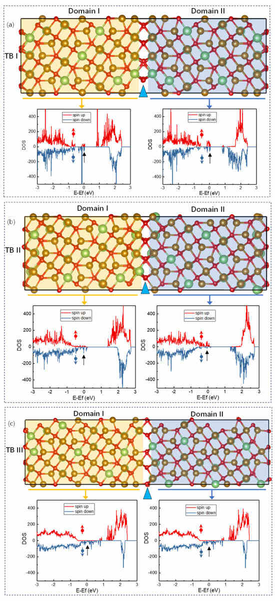 Spin-polarized DOS plots of TB I (a), TB II (b), and TB III (c);The black arrow denotes the EF, and the red and dark blue arrows represent spin-up and spin-down states on the DOS plot.The atoms within and near the boundary are indicated by colored shading. The relaxed atomistic models are also given for reference, and the vertical blue arrows denote the boundary of three types of TBs, respectively.