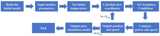 In this study, the three-dimensional materials science simulation software Materials Studio 2023 developed by Accelrys Company was used for the simulation, the force field was the COMPASS II force field adapted to the complex molecular environment, and the boundary conditions were set to be periodic, which can eliminate the influence of the boundary between asphalt molecules. In order to simulate the process of asphalt molecules miscible with each other efficiently, the temperature was controlled by the Nose–Hoover method and the pressure was controlled by the Andersen method. The truncation distance in this paper was set at 15.5 Å, the van der Waals non-bonding effect was calculated by the Atom-based method, and the electrostatic non-bonding effect was calculated by the Ewald method to make sure that the accuracy of the simulation experiments met the minimum demand of model iteration. The modeling process used the Amorphous Cell module to build the corresponding molecular model; the initial density was set to 0.1 g/cm3 to ensure the random distribution of molecules and then the molecules were mixed within the original asphalt model sufficiently by using the NVT system at 300 ps (with the number of particles in the system (N), the volume (V), and the temperature (T) kept constant). Then, a 500 ps simulation was performed in the NPT system (with the number of particles in the system (N), pressure (P), and temperature (T) kept constant) for 500 ps to make the system shrink in volume until the cell dimensions were stable and the change in each time step was small. In order to minimize the total energy of the molecular structure of the asphalt, geometry optimization iterations were performed using the Forcite module for 20,000 steps with the default accuracy set to Fine and constant convergence through the iterations to ensure the correctness of the structure. Finally, different asphalt models were built. The simulation flow is shown in Figure 1.