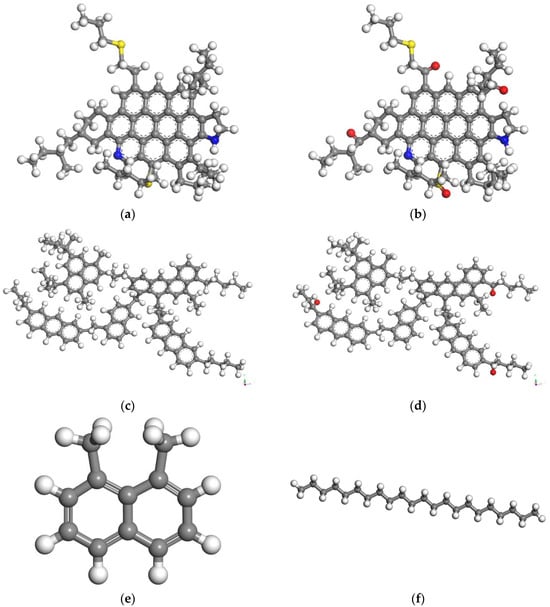 Su et al. [31] constructed a model of asphaltene components that was verified by experiments documented in the literature such as nuclear magnetic resonance (NMR) analysis, quantum chemical methods, X-ray scattering techniques, small angle analysis, etc. Asphaltene contains a small number of short, branched chains with a moderately sized aromatic ring [32]; therefore, in this paper, we selected the molecule shown in Figure 2a as a representative molecule of asphaltene. Resins are layered structural fractions composed of thick cyclic aromatic hydrocarbons and alicyclic hydrocarbons [33]; so, in this paper, the molecule shown in Figure 2c was selected as a representative molecule of asphalt resin. The chain lengths of alkane molecules in bitumen are distributed between C16 and C36, where C22 is just distributed in the middle part of this region. Bitumen contains the highest content of C22H46 among alkanes and, at the same time, the softening and boiling points of C22H46 are consistent with those of the majority of the oils in bitumen [34]. Therefore, in this paper, the molecule shown in Figure 2e was selected to be the saturated fraction representative molecule. In addition, the number of aromatic rings and the number of straight chains in the molecular structure of 1,7-dimethylnaphthalene are similar to the number of aromatic fractions of asphalt [35]; therefore, the molecule shown in Figure 2f was selected to represent the aromatic fraction molecule in this paper. Additionally, based on the study of the aging mechanism of asphalt caused by oxidation [36,37], ketone and sulfoxide were identified as typical functional groups formed after asphalt oxidation. Long-term oxidative aging (PAV) can be characterized by adding these functional groups to the oxidation-prone sites of asphaltene and resin models. For instance, ketone is formed by replacing the hydrogen atom originally attached to the benzyl carbon (the first carbon connected to the aromatic ring) with an oxide, and sulfoxide is formed by adding an oxide to the oxidation-prone sulfur atom. The models of PAV-aged asphaltene and aged resin are depicted in Figure 2b,d. In summary, the four-component molecular model of asphalt was established in Materials Studio software, as illustrated in Figure 2.