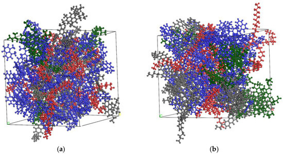 Molecular model of asphalt (note: red represents saturate, blue represents aromatic, green represents asphaltene, and grey represents resin). (a) Original 70# matrix asphalt; (b) PAV-aged 70# matrix asphalt.