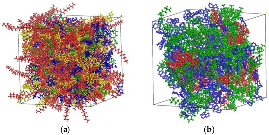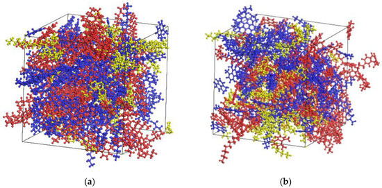 Molecular model of each rejuvenated asphalt (note: blue represents original asphalt, red represents aged asphalt, and yellow represents rejuvenator). (a) Extracted oil-rejuvenated asphalt; (b) wood tar-rejuvenated asphalt.