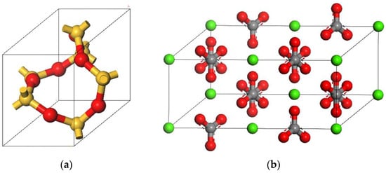 Aggregates in asphalt mixtures are taken from a wide variety of materials, and different mineral compositions can lead to significant differences in their physical and chemical properties. It has been shown that the acidity or alkalinity of the aggregate is a key factor affecting its adhesion properties to asphalt [42]. For example, acidic aggregate quartz, primarily composed of silica, and alkaline aggregate calcite, mainly consisting of calcium carbonate, exhibit contrasting properties. In order to investigate the influence of aggregate properties on asphalt–aggregate inter-adhesion properties, quartz crystals and calcite crystals from the Cambridge Crystal Structure Database (CSD) were selected in this study to represent acidic and alkaline aggregates, respectively, with the modeling units illustrated in Figure 6. The lattice parameters of the two minerals are detailed in Table 3.
