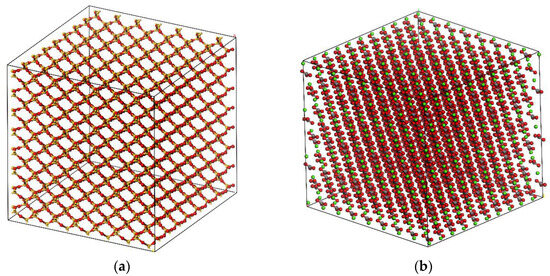 Aggregates in asphalt mixtures are typically mechanically processed to create crushed surfaces, with the aggregates tending to break along surfaces with weak interatomic bond strengths. Therefore, in this study, the quartz {0 0 1} surface and the calcite {1 0 4} surface, as commonly exposed surfaces [30], were selected. The crystals tool was utilized to build the cellular structure and incorporate three-dimensional periodic boundaries, while the supercell tool was employed to construct the supercell structure. This was performed to ensure that the aggregate cellular parameter closely approximated the cellular parameter of the asphalt molecule. The aggregate model is depicted in Figure 7.