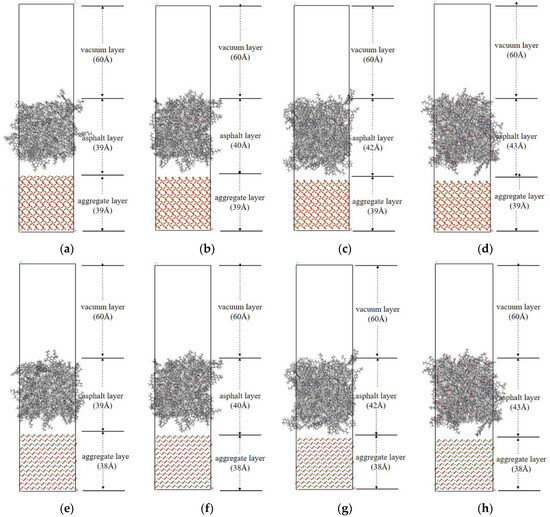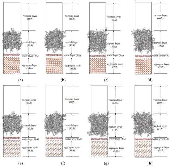 Model of the asphalt–water–aggregate interface. (a) VA–water–quartz; (b) PA–water–quartz; (c) EA–water–quartz; (d) WA–water–quartz; (e) VA–water–calcite; (f) PA–water–calcite; (g) EA–water–calcite; and (h) WA–water–calcite.