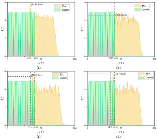 Relative concentration analysis plots for each asphalt–quartz interfacial model. (a) VA–quartz; (b) PA–quartz; (c) EA–quartz; and (d) WA–quartz.