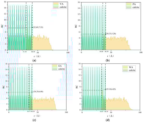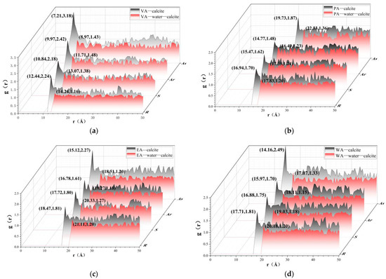 RDF curves of each asphalt with calcite under different humidity conditions. (a) VA–quartz; (b) PA–calcite; (c) EA–calcite; and (d) WA–calcite.
