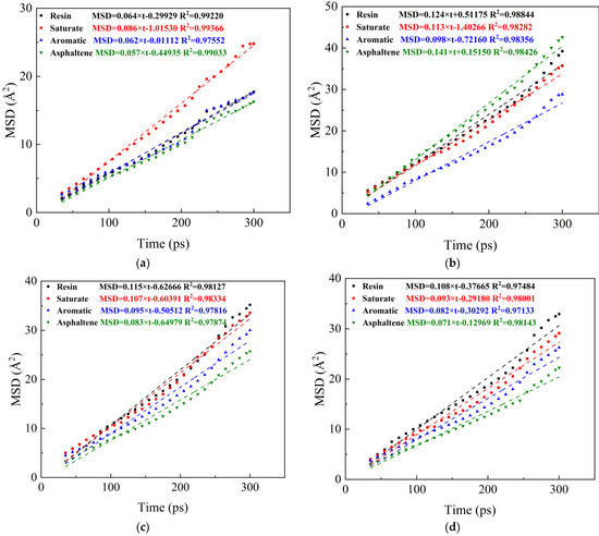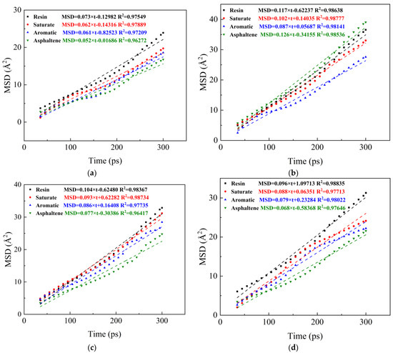 Mean square displacement curves of asphalt components in the quartz interface. (a) VA–quartz; (b) PA–quartz; (c) EA–quartz; and (d) WA–quartz.
