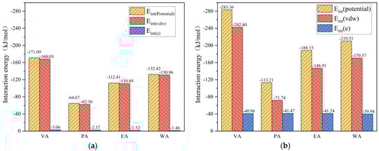 Interaction energy of asphalt in different aggregates. (a) Quartz; (b) calcite.