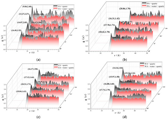 RDF curves of each asphalt with quartz under different humidity conditions. (a) VA–quartz; (b) PA–quartz; (c) EA–quartz; and (d) WA–quartz.