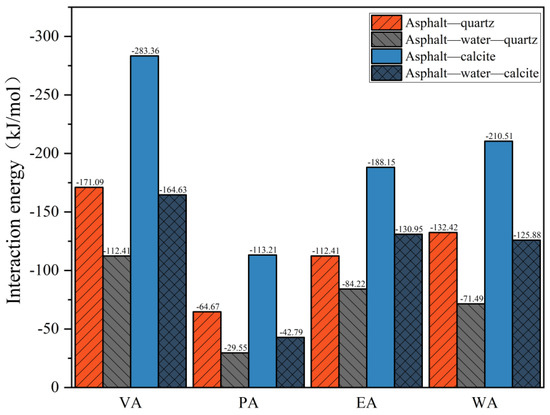 is the interaction energy between the asphalt and aggregate in different models, representing the energy required for individual systems to overcome intermolecular forces and merge into a single system. A higher value indicates a stronger interaction between different molecules. The value is calculated as shown in Equation (9). The interaction energy results between the asphalts and aggregates are illustrated in Figure 14.