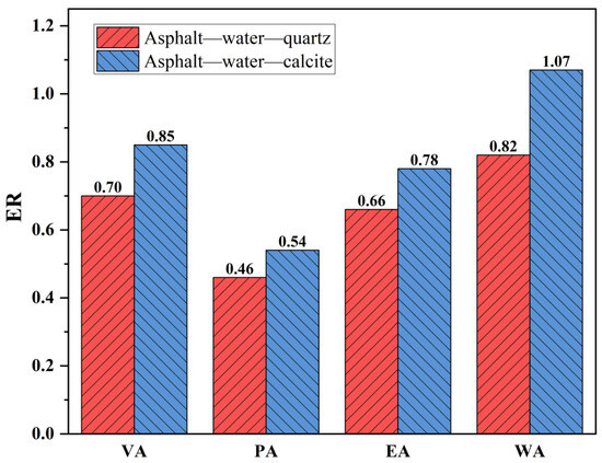 To further quantitatively analyze the ability of each asphalt to resist water damage in different aggregate systems, the energy ratio (ER), defined as the ratio of adhesion work to stripping work, was used. Adhesion work refers to the energy required to bond asphalt and aggregate per unit area; a higher value indicates tighter bonding. Stripping work refers to the energy needed to displace water from the asphalt mixture per unit area. Because of the hydrophobic nature of asphalt and the hydrophilic nature of aggregates, stripping is a spontaneous process that does not require external energy; thus, lower stripping work means water replacement is less likely. Therefore, a larger ER value indicates stronger resistance to water damage. ER values are calculated as shown in Equations (12)–(14), and the results for each asphalt in different aggregate systems under wet conditions are presented in Figure 18.