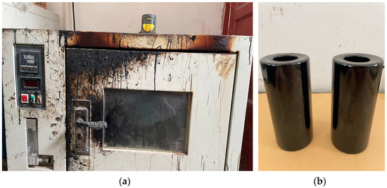 The long-term aging test apparatus and specimens: (a) the standard molds and (b) the asphalt mastic specimens.
