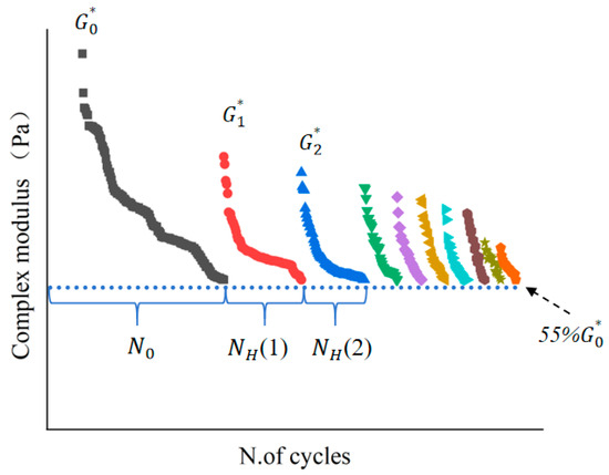 This study used time sweep (TS) to conduct the self-healing research on asphalt mastic [41]. Furthermore, to more realistically simulate actual asphalt pavement loading conditions, this paper selected multiple fatigue intermittent loading modes. Ten fatigue intermittent loading tests were conducted under strain-controlled conditions, with a strain level of 1.25%, a loading frequency of 10 Hz, and a temperature of 25 °C. The loading was halted when the complex shear modulus decreased to 55% of its initial value, followed by an intermittent period of 30 min, after which the test was resumed.