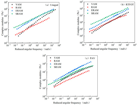 Figure 11 shows the dynamic modulus master curves of the four asphalt mastics at different degrees of aging. As can be seen from Figure 11, the SRAM and ERAM show high dynamic shear moduli in the whole frequency range, both in the unaged, short-term aging, and long-term aging states. Moreover, the complex shear moduli of all four asphalt mastics increased to a certain extent after both the short-term and long-term aging effects.