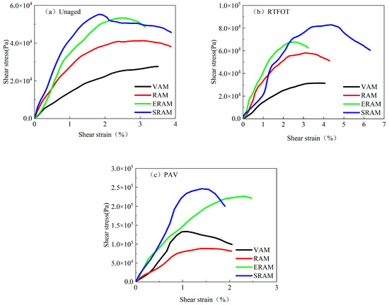 Stress–strain curves of four different asphalt mastics: (a) unaged, (b) RTFOT, and (c) PAV.