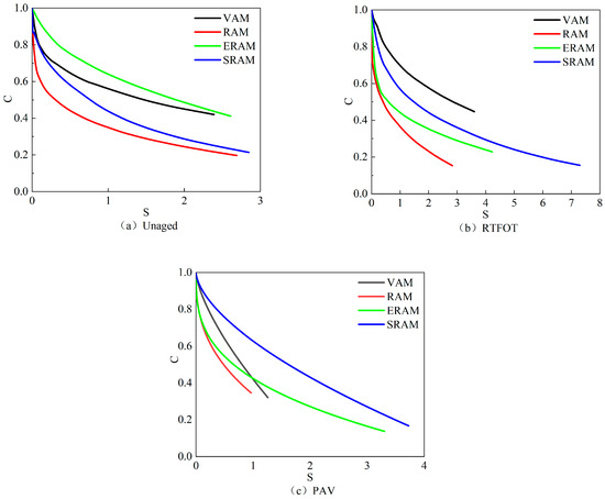 Figure 12 presents the stress–strain curves of the four asphalt mastics under different aging degrees, with the endpoints corresponding to the shear stress and strain at the fatigue failure point. It can be seen from Figure 12 that all four asphalt mastics have peak stresses under different aging conditions, but the locations and widths have changed. The wider peak stress of asphalt mastic represents the larger shear strain it can withstand. The changes in the locations and widths of the peak stresses are due to the differences in the warm mixes and the degree of aging. Under different aging conditions, SRAM has the highest peak stress, and ERAM has the second-highest peak stress, indicating that the addition of a warm mix enhances the fatigue damage resistance of RAM to a certain extent. Comparing the stress–strain curves under different aging conditions, it was found that the Sasobit warm mix had a more noticeable effect on the fatigue resistance of rubber asphalt mastic.