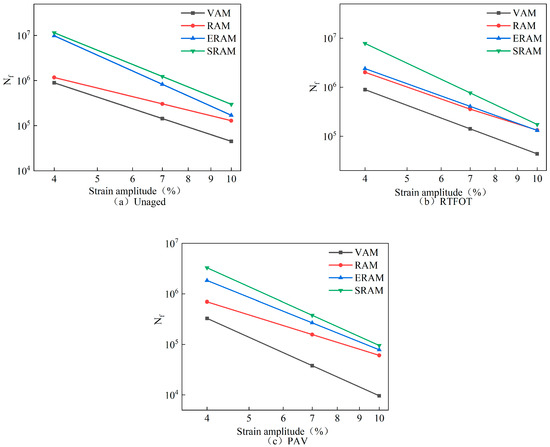 Comparison of fatigue life before and after asphalt mastic healing at 5% strain level: (a) unaged, (b) RTFOT, and (c) PAV.