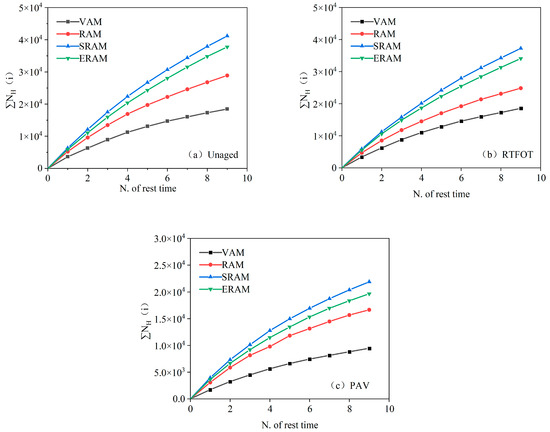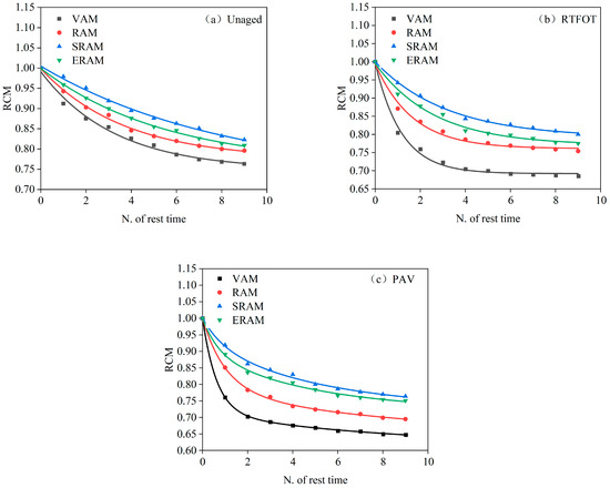 Relationship between RCM and the number of rest time: (a) unaged, (b) RTFOT, and (c) PAV.