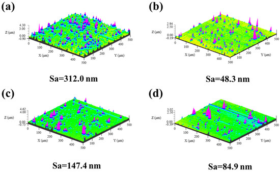 Surface roughness of films with different target powers: (a) 4 kW; (b) 8 kW; (c) 12 kW; and (d) 16 kW.