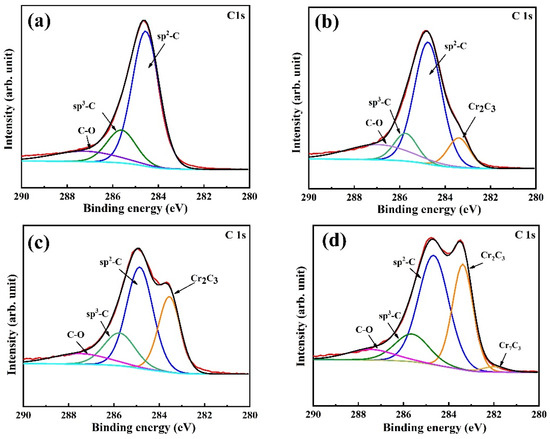To investigate the influence of target power on the chemical bonding status of carbon atoms in the films, C1s’ high-resolution fitting analyses were conducted for several film groups, as shown in Figure 7. All films exhibit a main peak at around 284.6 eV and the shoulder peaks at around 283.5 eV can be observed in films deposited at 8, 12, and 16 kW. Especially, the film deposited at 16 kW shows that the intensity of the shoulder peak is comparable to that of the main peak. The C1s peak could be deconvoluted into four peaks at around 287.4 eV, 285.6 eV, 284.7 eV, and 283.1 eV, corresponding to C−O, sp3−C, sp2−C, and Cr−C bonds, respectively. The absence of a Cr−C peak in the film deposited at 4 kW is due to the low Cr content, as it primarily exists in a dispersed solid solution form within the amorphous carbon network. Additionally, in Figure 7d, the film displays a low binding energy peak at 282.8 eV, which was attributed to the Cr−C bond. According to previous works, the Cr−C bonds at the binding energy peaks of 282.8 eV and 283.1 eV belong to Cr7C3 and Cr2C3, respectively [21,33]. As the target power increases, the intensity of the Cr2C3 peaks gradually rises, indicating that the Cr content increases in films. At the highest Cr content, as shown in Figure 7d, the Cr7C3 phase appears. As a carbide-forming element, the Cr doped into the film forms carbides with C. Following an increase in Cr content due to the higher Cr target power, the formation of carbides also increases. The presence of C−O bonds may be attributed to the oxygen adsorption on the sample surface in ambient air before XPS detection.