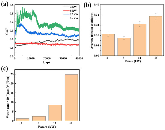 The variation in the friction coefficient of films under different target powers is depicted in Figure 9a. The films deposited at relatively low target powers (4 kW and 8 kW) enter a stable friction coefficient (COF) stage after a brief running-in period. At the stable stage, the film deposited at 4 kW showed a COF at around 0.17 and that of the film deposited at 8 kW remained around 0.14. The COFs of the films deposited at high target powers exhibit significant fluctuations, with higher values at the onset of friction. The COF of the film deposited at 16 kW reached 0.5. This is because when the ball and film first come into contact, the ball surface does not form a lubricating transfer film, resulting in higher friction coefficient values within the initial 10,000 cycles. As the number of friction cycles increases, the films gradually enter a stable running-in period, and after 15,000 cycles, the friction coefficients stabilize at around 0.25 and 0.31, respectively. The corresponding wear rates of films are shown in Figure 9c. As the power increases from 4 kW to 16 kW, the wear rate of the film rises from 1.28 × 10−7 mm3/N·m to 2.48 × 10−6 mm3/N·m. This is attributed to the presence of hard carbide phases in the film at high doping levels, which cause abrasive wear and result in greater wear depths, leading to an increase in the wear rate [37]. The changing trend of wear rate described above is also consistent with the result of H3/E2, shown in Figure 8b.
